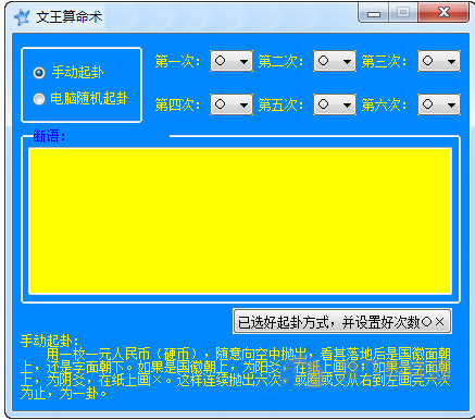 文王算命用一枚一元硬币,随意向空中抛出,看其落地后是国徽面朝上,还是字面朝下。如果是国徽朝上,为阳爻,在纸上画一圆圈;如果是字面朝上,为阴爻,在纸上画一叉。这样连续抛出六次,或圈或叉从右到左画完六次为止,为一卦。对应着下面的六十四个卦自己找“吉凶祸福”就可以了。