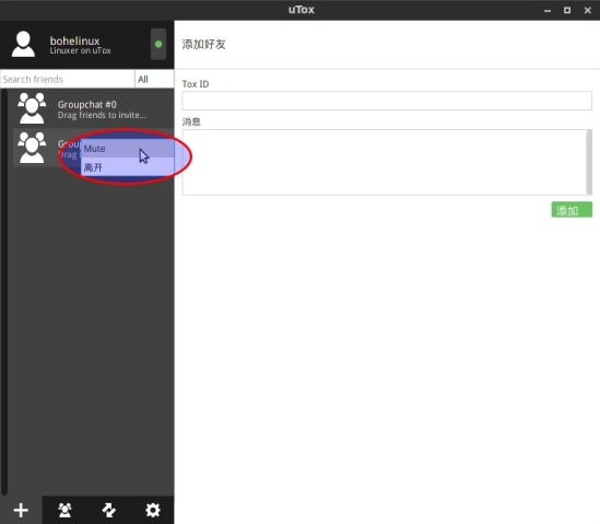 1、打开uTox后,软件会自动给你生成一个ID;