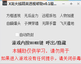 X龙火线精英透视辅助是一款支持方框透视、无后坐力、远程拆包、人物加速等等强大功能的辅助器。欢迎来此下载使用!