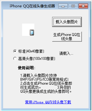 iPhoneQQ在线头像生成器是一款让你将QQ在线的状态改成为iPhoneQQ在线的状态。装逼必备,欢迎下载使用!