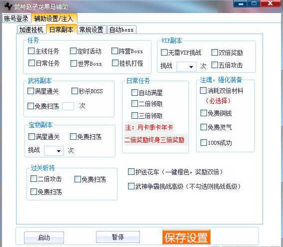 武神赵子龙黑马辅助是一款能够为玩家提供自动主线、自动坐骑、自动日常任务、自动BOSS等实用功能的辅助工具。有需要的可以来此下载!