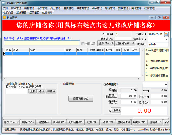 灵秀电脑收银系统是一款适用于各行各业,功能齐全,提供了电脑收银,会员管理,打印小票等功能的电脑收银系统。还可以连接会员读卡器、扫描枪、电子秤等设备,欢迎下载!