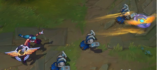 特效方面,整体上变化不大,除了Q技能在挥甩出去的是队徽,而留下了深刻的金色的印记之外,W技能也能看到这种印记,不同的是,不是星星点点的落痕,而是模糊的旋转色彩。