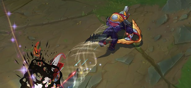 技能特效方面,没有多少变化的地方,R技能是变化最大的地方,释放之后,屠夫四周的光效改成了白色透明色和绿色的刀痕粒子效果,另外E技能的极速跑动的紫色是金色的效果,其中还带有了绿色的效果。