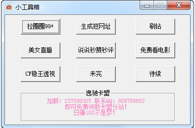小工具箱是一款可以帮助用户提供为用户提供拉圈圈99+、生成短网址、刷钻、美女直播、说说秒赞秒评、免费看电影、CF稳王透视等功能的辅助工具。有需要的可以来此下载!