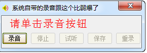 软件窗体上写着“系统自带的录音机跟这个比弱暴了”,这些大家可别当真,它就是一个简易的电脑录音软件,有录音、停止、试听、保存、重录,这几个功能,倒是体积小巧。