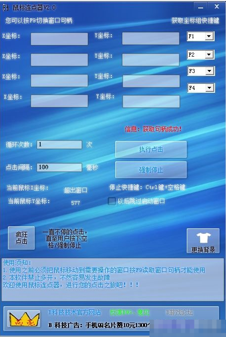 1.使用之前必须把鼠标移动到需要操作的窗口按F9读取窗口句柄才能使用。