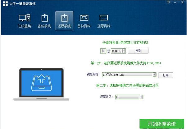 大侠自动查找本机系统镜像,无论存放何处,依旧实 现重装,一键即可让电脑焕然一新。