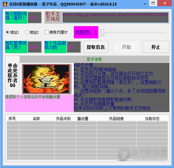 皇子全民K歌刷播放量是一款支持刷新间隔,刷新次数,线程数的工具。让你的K歌播放量瞬间爆表。欢迎来此下载使用!