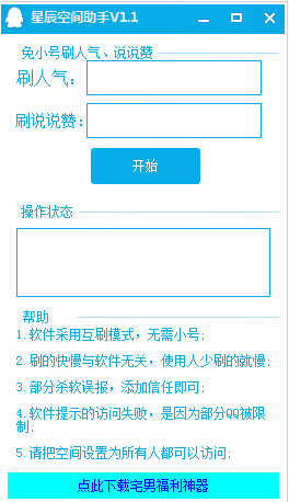 星辰空间助手软件是一款不仅可以刷QQ空间人气,还能刷qq空间说说赞是实用工具。助你玩转QQ空间。欢迎来此下载!