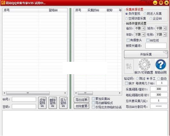 等同于QQ客户端查找面板,但无需依赖和登陆客户端,可以自定义设置省份、城市、年龄、性别,以及是否在线。添加好一批自己的登陆小号即可,可以循环多轮采集,配带自动识别验证码以及全能的换IP模块(点击观看 换IP、验证码自动识别通用设置-视频教程 ),让你无值守挂机大量疯狂采集,你是否还HOLD住~