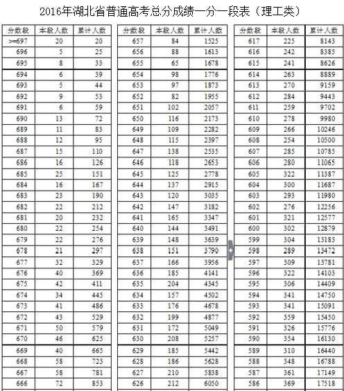 一分一段表是湖北省根据2016年的所有学生的高考成绩而统计出来的每一分数线的人数,这样就可以知道考生的分数段的全省排名情况了。
