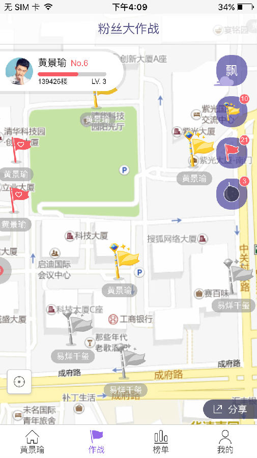 【游戏追星,插旗应援】独有的游戏追星模式,通过插旗占楼为明星应援,攻城略地。