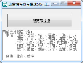 这是一款不错的网络加速器,软件不仅不仅支持电信宽带提速,而且还支持少数联通宽带提速。软件方便简单,能够一键提速到50m,效果显著,赶紧来试试吧。