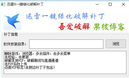 先安装官方原版软件,安装后运行迅雷9一键绿化破解补丁,选择安装目录,点击打补丁按钮