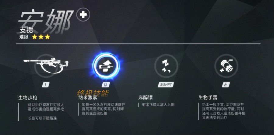 纳米激素强化(Q):安娜为队友注射战斗药剂后,短时间内队友的移动速度变快、造成更多伤害,并降低敌人所造成的伤害。