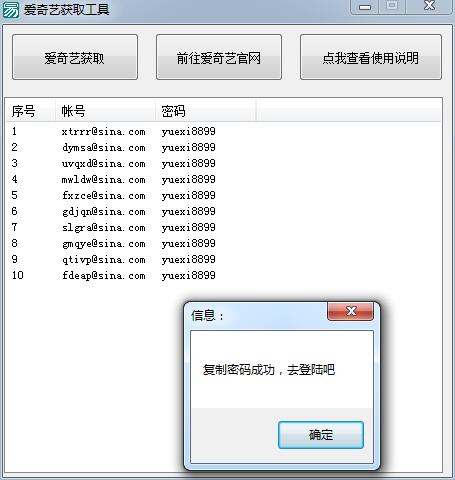 爱奇艺获取密码获取器是一款免费的软件,该软件可以帮助用户免费获取爱奇艺vip账号,从而免费观看爱奇艺所有付费电影和电视剧,爱奇艺获取密码获取器是您追剧的好帮手,欢迎有需要的朋友下载体验!