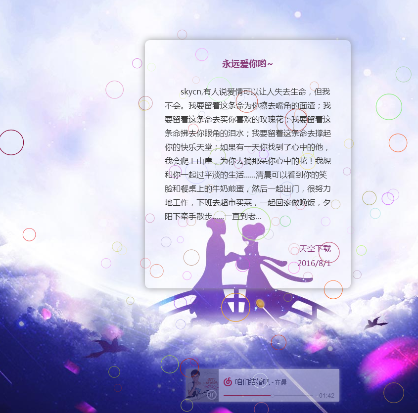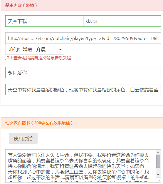 七夕马上就要来临啦,这是一款七夕创意表白的生成器,勇敢的卖出第一步跟你最爱的人说:好想从现在开始抱着你,紧紧的抱着你,一直走到上帝面前。