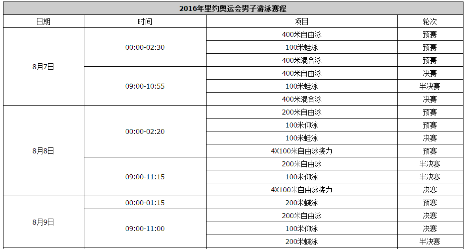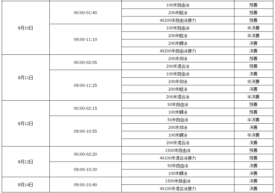 8月11号 09:00-11:25 男子100米自由泳决赛