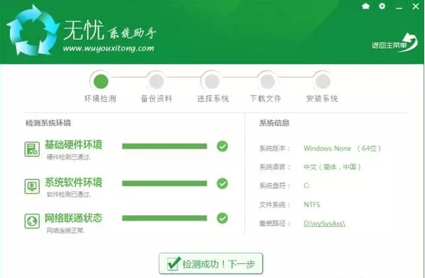 点击“在线重装”后软件会扫描本地环境信息,检测成功后点击“下一步”继续进行资料备份
