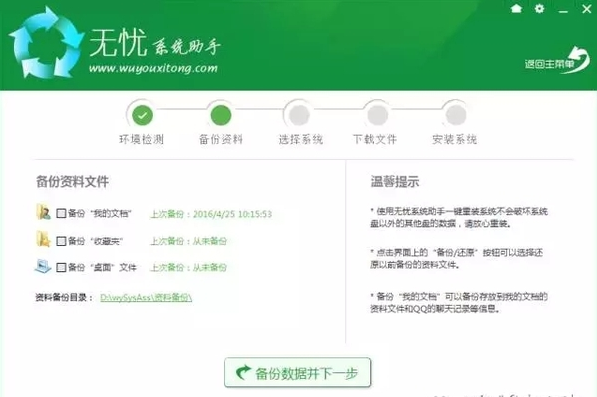软件会备份你电脑上一些重要文件资料“文档”、“收藏夹”、“桌面”的文件夹,选择需要备份的目录,点击下一步继续,选择想重装的系统;