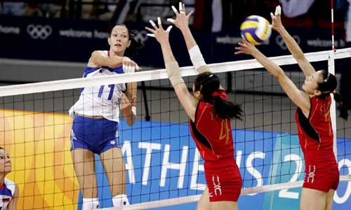 排球比赛中,双方的攻防转换始终是在激烈的对抗中进行。高水平比赛中,对抗的焦点在网上的扣拦上。在一场比赛中,夺取一分往往需要经过多个回合的交锋。水平越高的比赛,对抗争夺也越激烈。