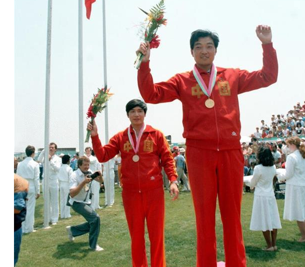 1984年7月29日,在洛杉矶奥运会上,中国选手许海峰以566环的成绩夺得男子自选手枪射击比赛金牌,成为中国第一个在奥运会上获得冠军的运动员,实现了中国在奥运史上“零”的突破。图为许海峰(前)在颁奖仪式上。