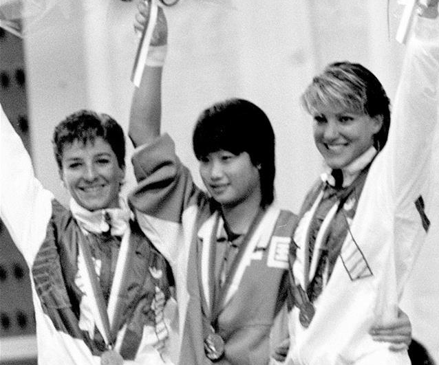 1988年9月18日,在汉城奥运会跳水女子10米跳台决赛中,中国选手许艳梅夺得金牌,为中国代表团夺得这届奥运会上的首金。图为许艳梅(中)在领奖台上向观众致意。