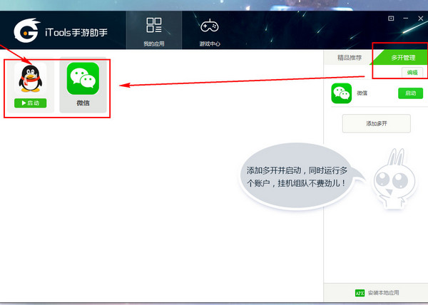itools手游助手是一款可以多开的手游模拟器,点击我的应用===点击多开管理==我们就可以看到,我们可以同时进行QQ和微信的登录