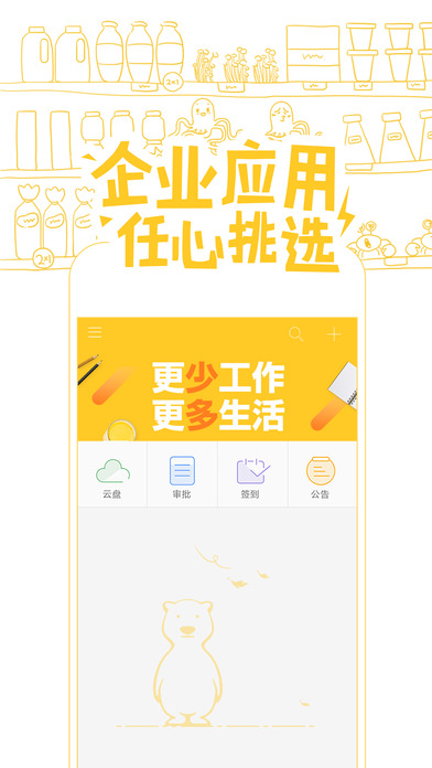 OA应用:团队云盘、考勤、审批等应用满足基本办公需求,更多办公应用尽在发现模块