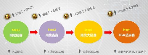 晋级流程:16个省的初赛(城市冠军)→16个省赛(省冠军)→南北2个大区赛(大区冠军和亚军)→TGA