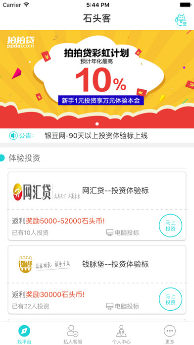 石头客软件iOS版是一款非常专业的投资导购返利手机服务平台,该软件和国内多家优质的互联网金融公司合作,致力为用户打造一条权威、透明、诚信的通道,让用户投资更加安全放心,欢迎下载!