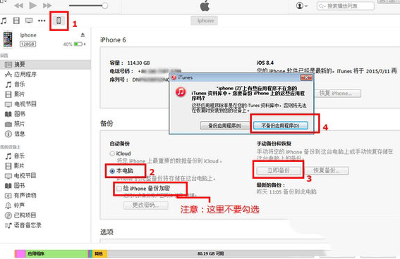 第三步:在itunes工具中备份数据(注意:不要勾选给iphone备份加密),以备份的方式在电脑上导出苹果镜像。