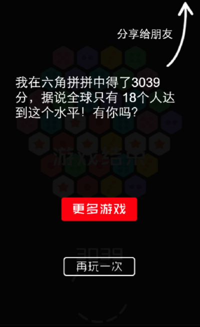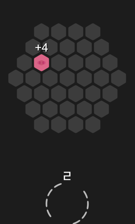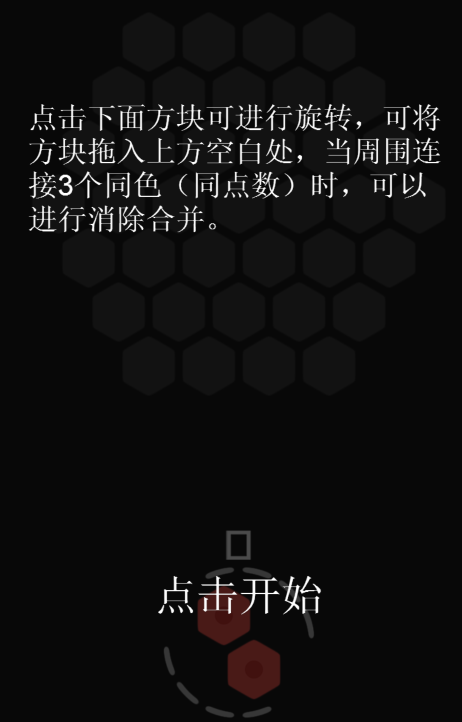 游戏界面是一个大六边形棋盘,六边形的每一边又由4个小六边形组成,构成共有37格的棋盘空间。玩家拖动系统自动输出的各种六边形组合置于大六边形的空白处,当大于等于3个相同颜色、点数相同的六边形碰到一起时就会相加升级并且消除得分,五角星六边形更有爆炸消除效果哟!而连续消除会有额外Combo加分。直到棋盘上再也无法摆下任意一个六边形组合的时候,游戏就会失败。