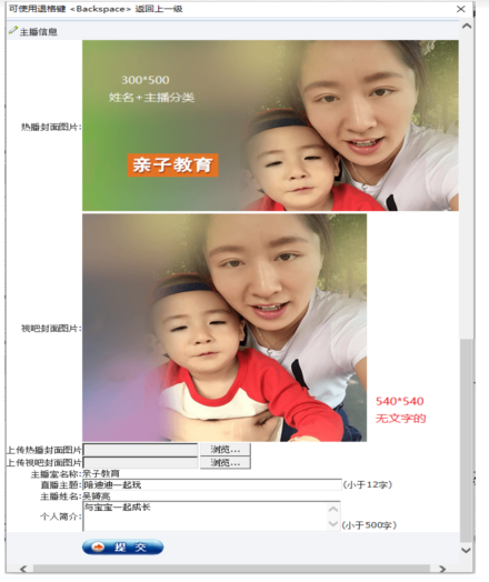 2、主播上传直播封面后,后台人员会对封面进行审核,审核未通过前,展示默认头像,封面图片分为热播封面图片、视吧封面图。热播封面图片长不超过960像素,宽不超过540像素,有姓名与主播分类。视吧封面图片:540*540,无姓名文字的。