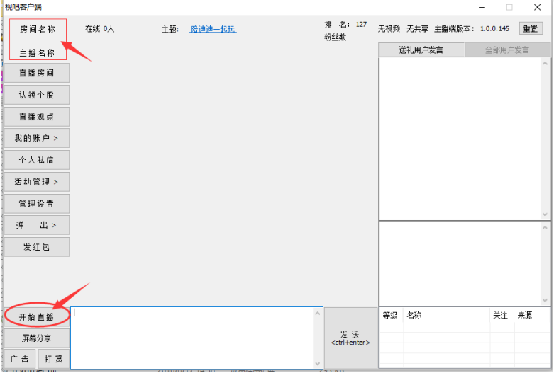 主播刚登录主播端时,还未创建房间,主播可以认领个股、写主播观点,等一切准备OK后,点击开始直播。