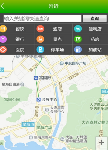 2.附近查询:支持附近位置POI信息查询,酒店 银行 景点 药房 医院 停车场等一键查询。