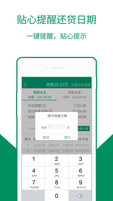 还贷日期提醒设置还贷日期提醒,每月提示还贷额,帮你轻松记账理财。