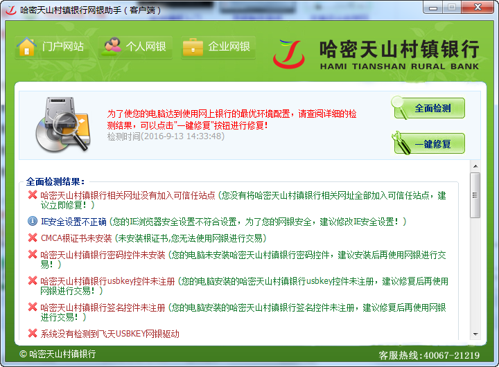 哈密天山村镇银行网银助手是一款专门为天山村镇银行用户打造的一款非常便捷的网银工具,该软件为广大用户提供方便,一键解决用户无法正常使用等问题,还可以帮助用户只能检测上网环境,为用户提供安全支付环境,欢迎下载使用!
