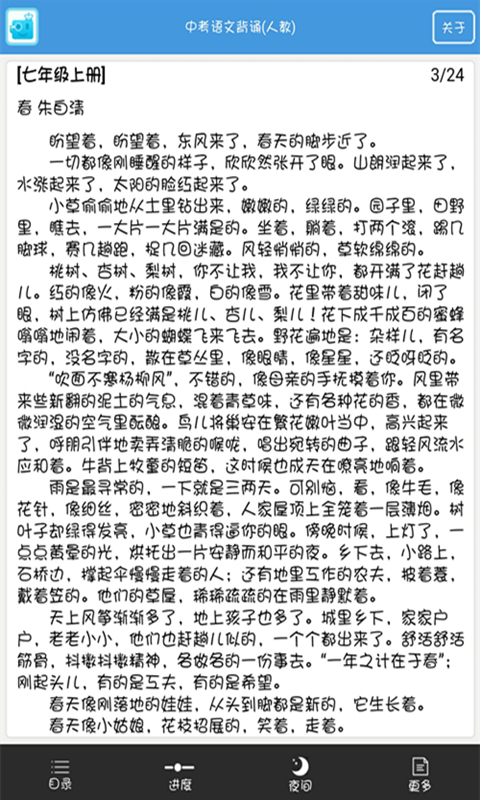 初中语文课文背诵手机版是一款读书教育学习应用软件,用户可以通过初中语文课文背诵手机版课外学习语文课文,阅读背诵需要考的课文篇章,初中语文课文背诵手机版将提供最全的课文,有需要的用户可以下载使用。
