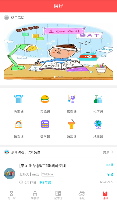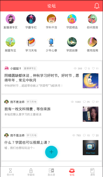 中考倒计时还提供一个覆盖初中各个学科的超级学团论坛,帮助中考学生课后充电,获取更多的知识。