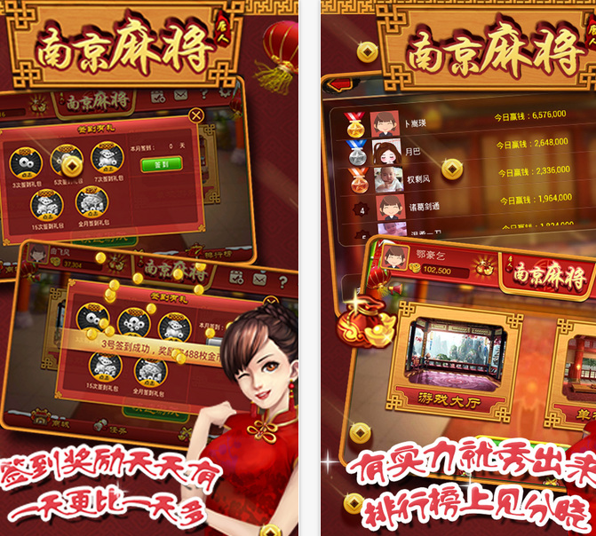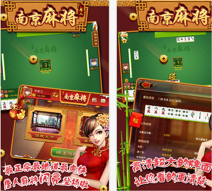 纯南京地方玩法,共有144张牌,分为东南西北4个风圈,每个风圈18排,36张牌。144张牌中,花牌有20张,分别是4张发财,4张红中,4张白板,春夏秋冬,梅兰竹菊。可碰,可杠,不可吃。详细规则请查看游戏内帮助。