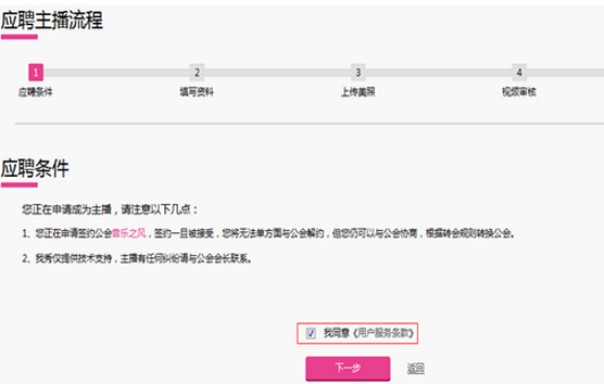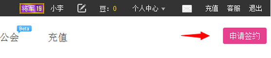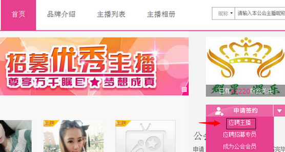 1、登陆状态下,点击首页右上角的“申请签约”,进入公会主播应聘页。