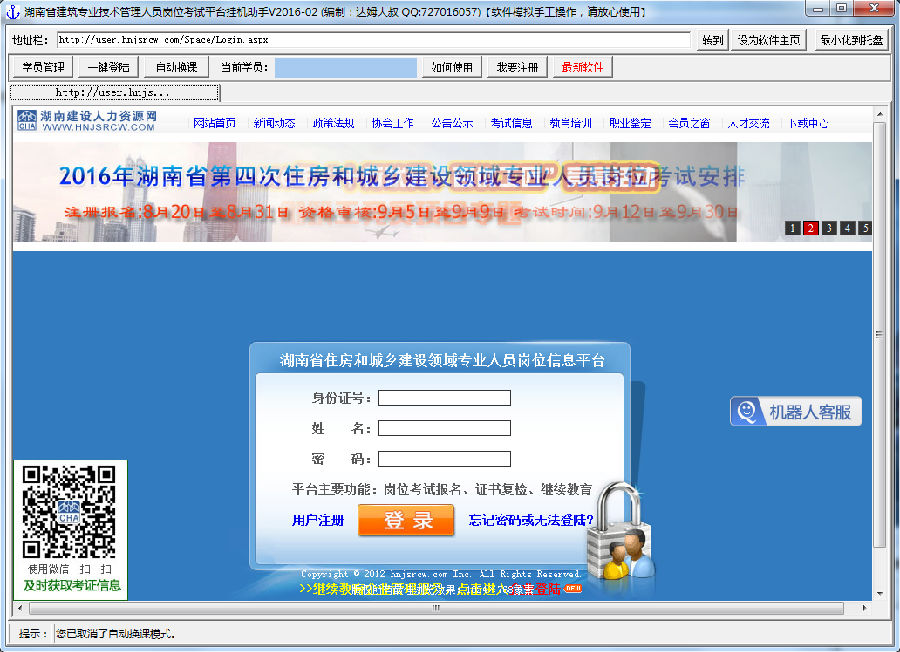 挂学时进度是必须的,这样手工学习时很是烦人,所以本人编写了湖南省建筑技术管理人员网络学习挂机助手。若使用本挂机软件在湖南省建筑专业技术管理人员岗位考试平台(九大员网上学习)远程学习则软件会自动更新学习时间并能学完一讲软件会自动转到下一讲继续学习,若用了自动换课功能则在学完一门课之后可自动换到下一门课继续学习,这样你可认真学习而不用担心学习时间问题了。本软件对在湖南省建筑专业技术管理人员岗位考试平台的各种远程培训学习。此软件只是为了让你学习时省去手工操作的烦恼,让你可认真学习里面的内容,请正确对待。