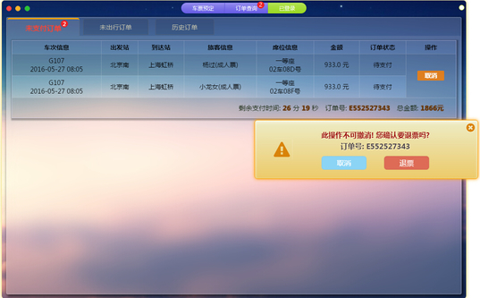 如果您对未支付的订单不满意,在30分钟之内,您可以选择取消订单再次抢票;