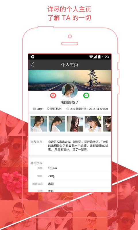 触动:打开触动,即可以看到为您推荐的异性头像,点击喜欢的头像就可以看到该异性的详细资料。包括其交友宣言、相片、基本资料、择友标准等。