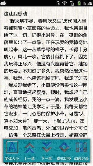 在内容阅读页按下菜单,可以进行更改字体、上一章、下一章、添加阅读记录等操作。阅读页向下轻滑即可阅读,一页阅后请向左轻滑即可。返回键可返回章节目录,按两次即可退出。