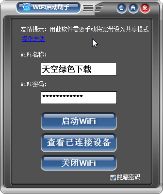 WIFI启动助手pc版这是一款绿色小巧wifi共享软件,操作起来特别简单实用,实用的时尚要手动把宽带设置为共享模式,而且无广告,让您体验极速上网的模式哦,有需要的朋友欢迎下载使用!