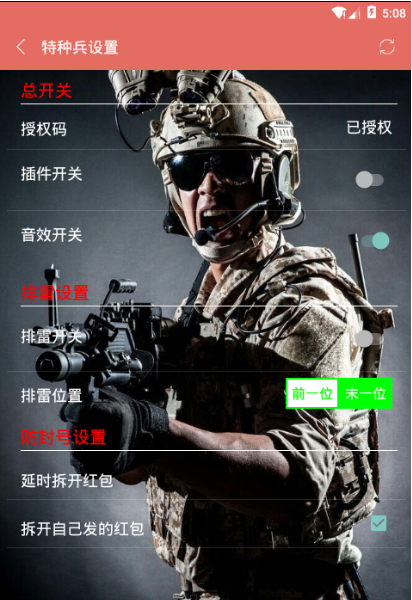 功能综合:秒抢.延时秒数.看穿包.不抢最小包.双尾.不抢尾数最小包.随意抢包设置.金额单位安全值设置.中间抢.排名位置雷.各种位置数值设置等...