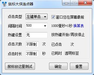 鼠标点击速度可以调节,鼠标左键右键也可以选择。所有游戏通用,最快速度0.1秒点击1次!使用方法超级简单,只要按下热键,让鼠标自动点击器帮你点击吧!鼠标大侠连点器。